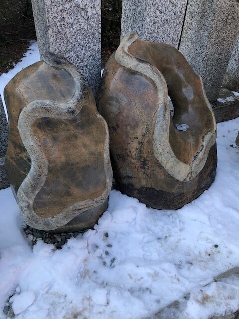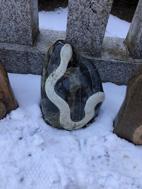 ① 蛇紋石(じゃもんせき) 社殿の南側に並ぶ、蛇の模様が自然に浮き出た珍しい石。
